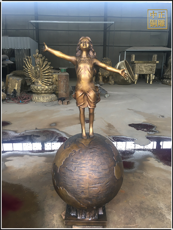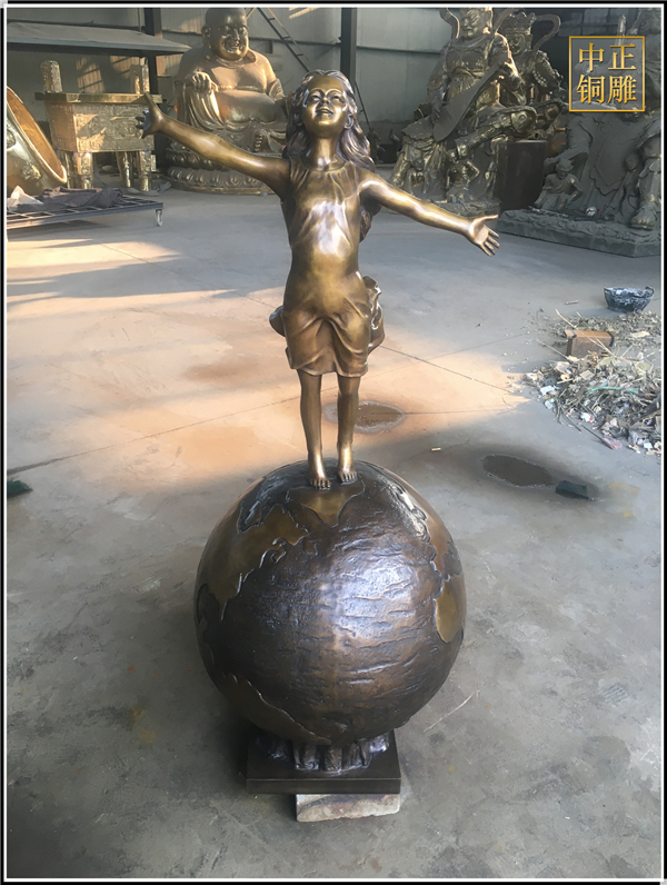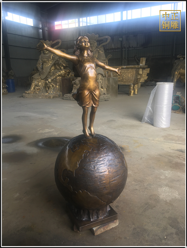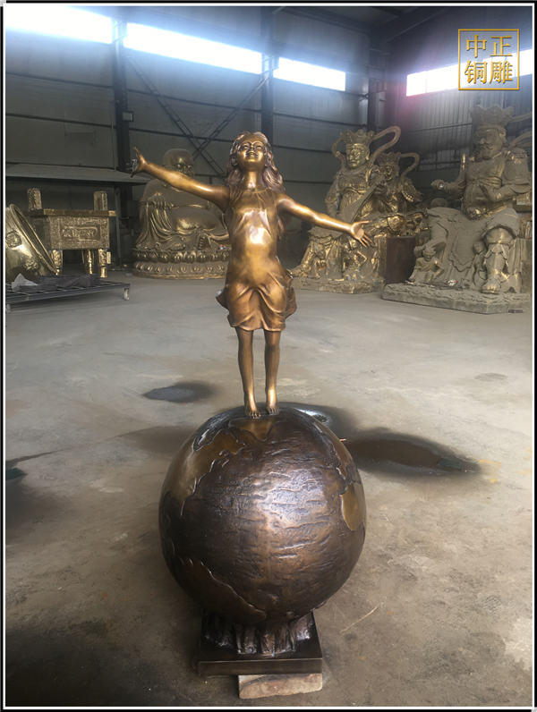 我公司生產的這件高1.5米的站在地球上的小女孩人物雕塑已發往江蘇省鹽城市,這件站在地球上的小女孩人物銅雕塑是以保護地球環境為主題設計制作的。